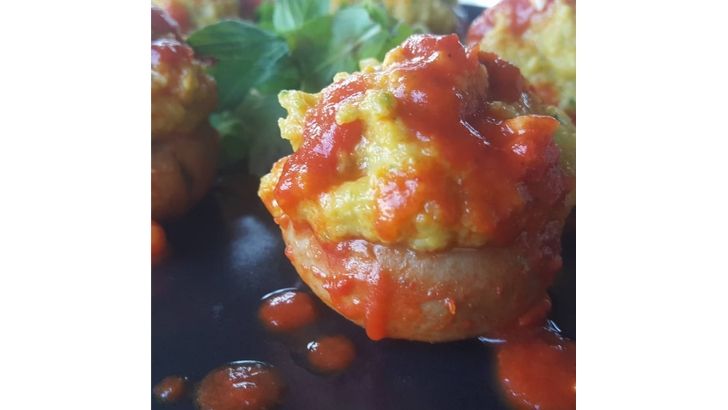 - Mantarlar tepsiye alınır ve içerisine bir tatlı kaşığı domates sosu eklenir. Ardından içerisine sırasıyla karıştırıcıdan çekilmiş ve toz haline getirilmiş 75 gr cevizden 1 tatlı kaşığı, 1 yemek kaşığı püre haline getirilmiş kabak ve 1 tatlı kaşığı domates sosu eklenir.
