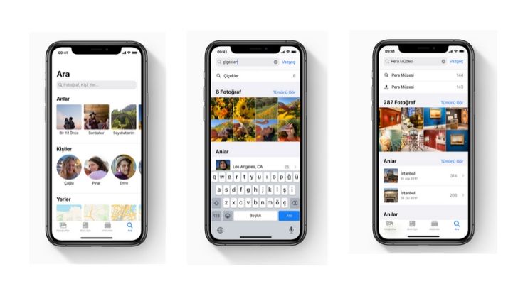 Akıllı yüz tanıma ve konum belirleme özellikleri, fotoğrafta birlikte yer aldığınız kişilere veya fotoğrafın çekildiği konuma göre arama yapabilmenizi sağlıyor ve tam da aradığınız fotoğrafı bulmanızı kolaylaştırıyor. Fotoğraflar uygulaması, resimlerinizdeki yerleri ve nesneleri tanımlayarak bunları kolayca aramanıza imkan tanır. Örneğin, “plaj”, “doğum günü pastası” ya da “annem” gibi kelimeler girerek arama yapabilirsiniz.