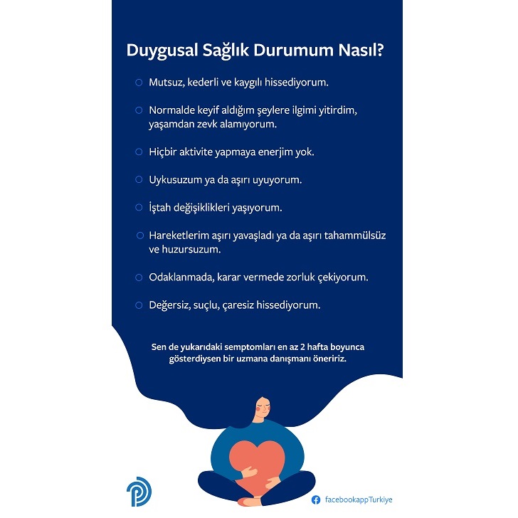 Facebook da 10 Ekim Dünya Ruh Sağlığı Günü kapsamında ruh sağlığı konusunda farkındalığı artırmak ve yeni kaynaklar sağlamak amacıyla Türkiye’de hayata geçirdiği çalışmalarını duyurdu. İnsanların ruhsal ve duygusal sağlık ihtiyaçlarını desteklemek için uzman kaynaklarla bağlantı kurmalarına yardımcı olmak isteyen Facebook, Türk Psikologlar Derneği ile ilham verici bir işbirliğine imza atarak insanların kendi ruh sağlıklarını değerlendirmelerine destek olmak amacıyla 8 maddeden oluşan bir ‘kontrol listesi’ oluşturdu. Bu liste ile insanların hem kendi ruhsal sağlıklarına hem de yardıma ihtiyacı olabilecek yakınlarının ruhsal sağlıklarına dair farkındalıklarının artması amaçlanıyor.