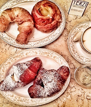 Bugünün planı oldukça yoğundu. Kahvaltı için Bolonya’nın en eski cafelerinden biri olan Cafe Terzi’de güne başladık. Mini minnacık bir yer, ama her daim kalabalık. Menü fix: Kahve &tatlı. Kahve kısmı kolay da, tatlıyı seçmek biraz zor. Biz de birazcık ‘şımaralım’ dedik, çeşit çeşit söyledik. İşin iyisi mi kötüsü mü bilmem ama, hepsini de yiyip bitirdik 🙂