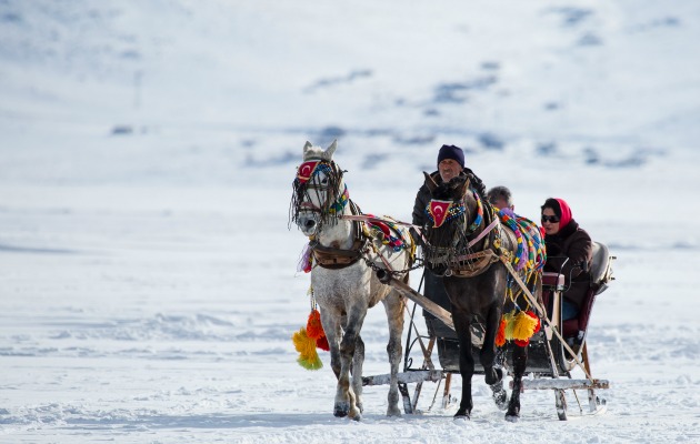 Türkiye’nin doğu ucunda, sanki kutup dairesinin içindeymiş gibi duran bir göl, Çıldır Gölü. Kış seyahatlerinden ve otantik deneyimlerden hoşlanıyorsanız, kalınlığı 45- 50 cm’e varan buz üzerinde yöreye özgü aynalı sazan balığı tutabilir ve at arabaları ile tur atabilirsiniz.