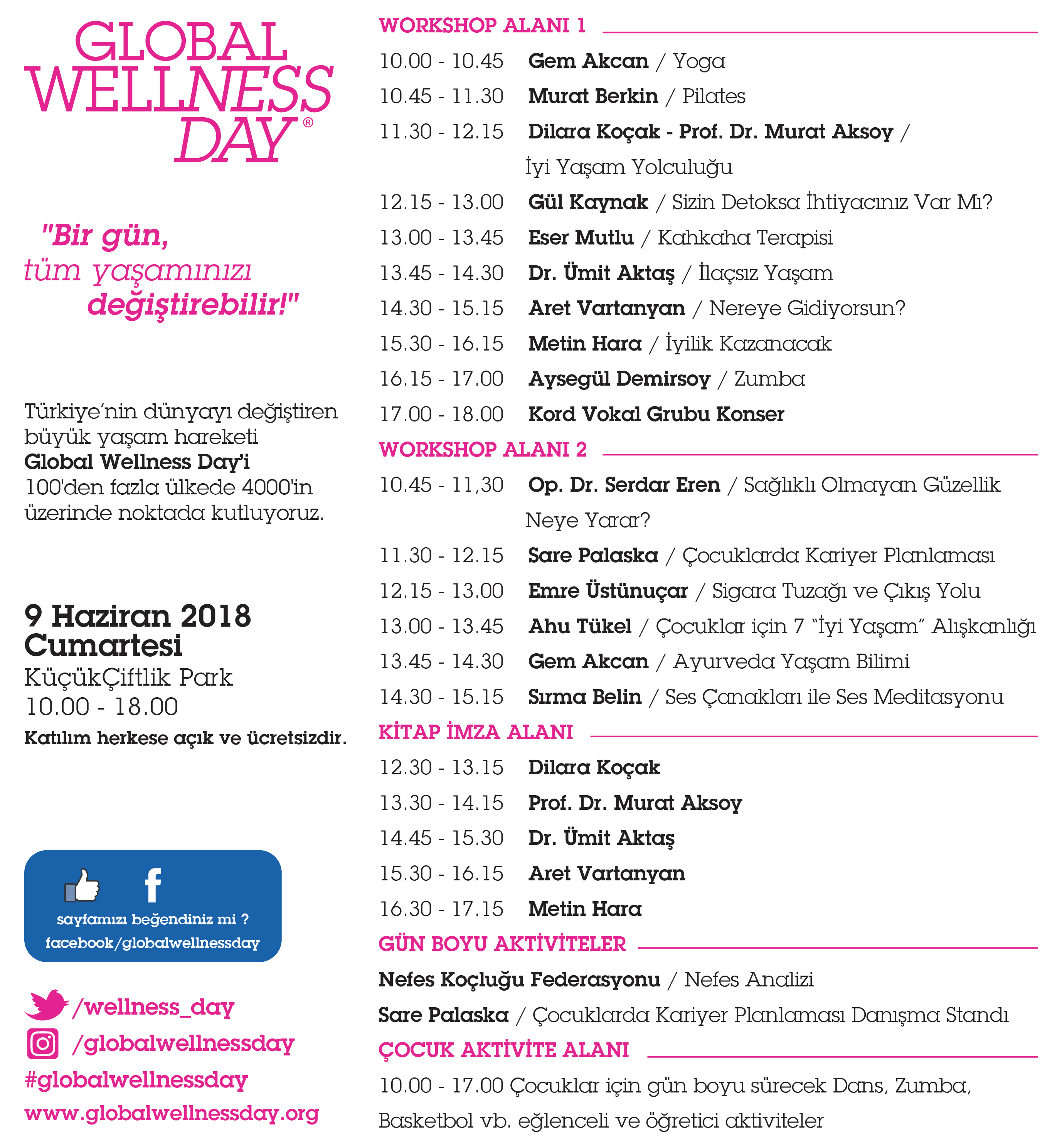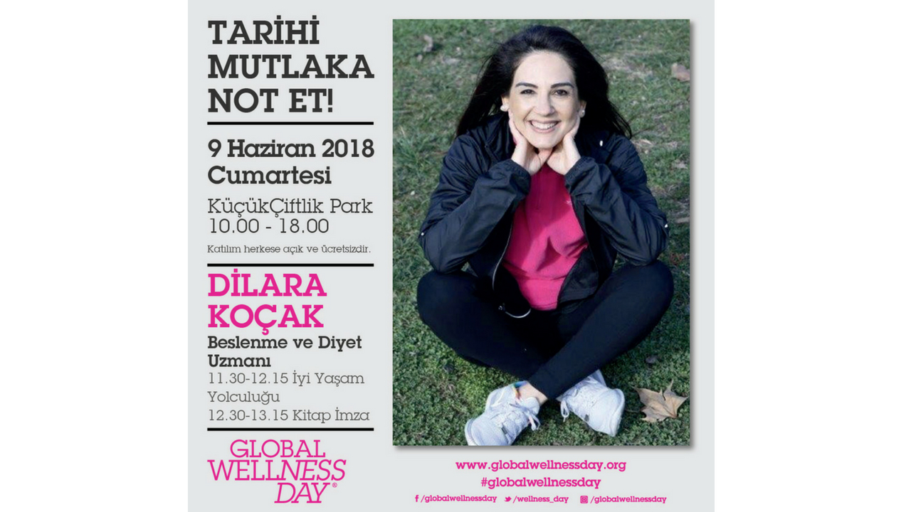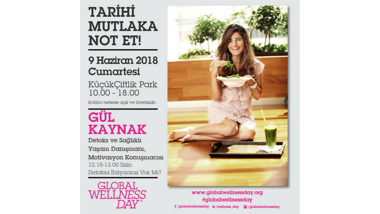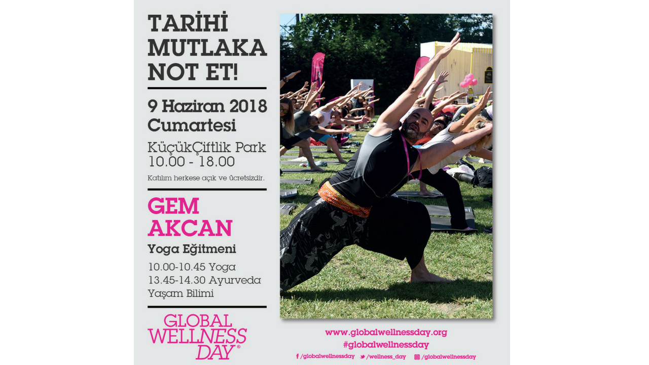 9 Haziran 2018 Cumartesi günü Global Wellness Day yedinci defa kutlanacak ve bu kutlamalar dördüncü defa dünya çapında gerçekleşecek. Etkinlik KüçükÇiftlik Park’ta düzenlenecek. GWD kurucusu Belgin Aksoy Berkin, “Bir gün tüm yaşamınızı değiştirebilir” sloganıyla 86 Küresel İyi Yaşam Elçisi, 3 danışman ve 23 ana destekçiden oluşan bir uluslararası ağa ilham verdi ve bu yıl 100’den fazla ülkede ve 4 binden fazla noktada ücretsiz iyi yaşam etkinlikleri düzenlenmesine ön ayak oldu.