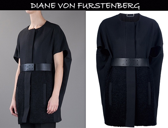 Farklı materyallerin birleşimi ve belinizin güzelliğini ortaya çıkartacak kemeriyle, yuvarlak yakalı Diane Von Furstenberg pelerin ile güçlü duruşunuzu sergilemeye hazır olun.