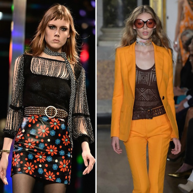 Marangozların devri, yüksek bel pantolonları ve disko dönemi ile bu bahar geri geliyor. Eğer tarzınıza 70’lerin trendlerini dahil ediyorsanız, Saint Laurent (solda) ve Emilio Pucci (sağda) gibi transparan, renk ve desen seçimleri ile süper bir retro still yakalayabilirsiniz.