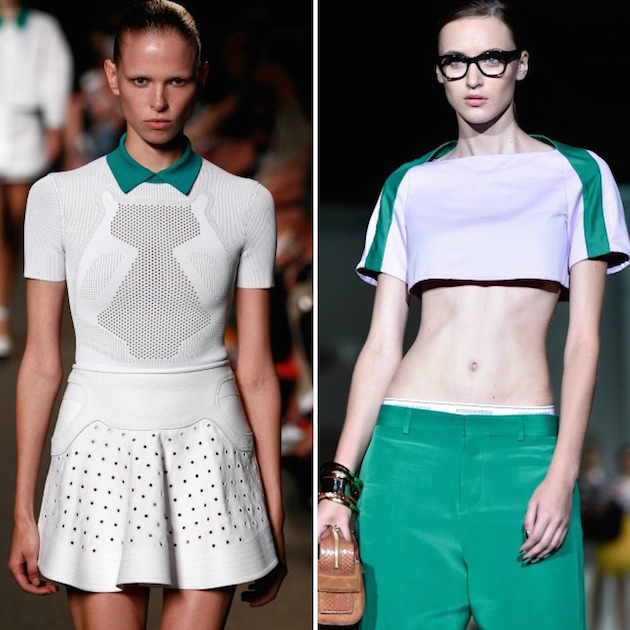 Alexander Wang bahar koleksiyonunun (solda) şık mini etekleri, sizde her an tenis oynama isteği yaratabilir. DSquared2 (sağda) kadınlara zarif ve sportif bir görünüm kazandırmak için koleksiyonuna zengin yeşil etekleri eklemiş.