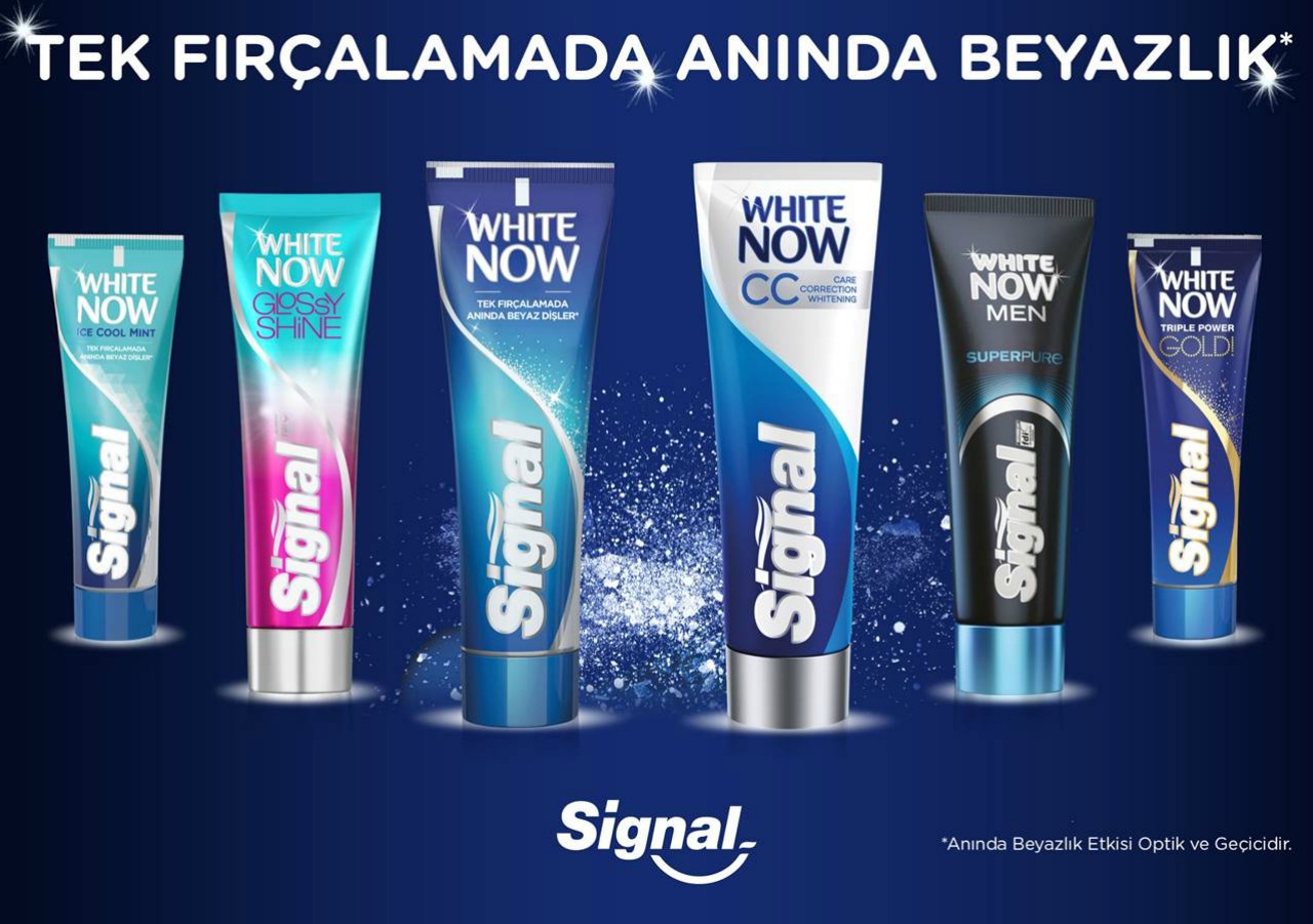 Signal White Now diş macunları, sadece bir kez fırçaladıktan sonra bile dişleri beyazlatır. Bununla beraber gözle görülen lekelerin aşamalı olarak giderilmesini ve zamanla daha beyaz dişlere sahip olmanızı sağlayan formülüyle Signal White Now diş macunları, gülümsemenizin güzelliğini en üst seviyeye taşır!