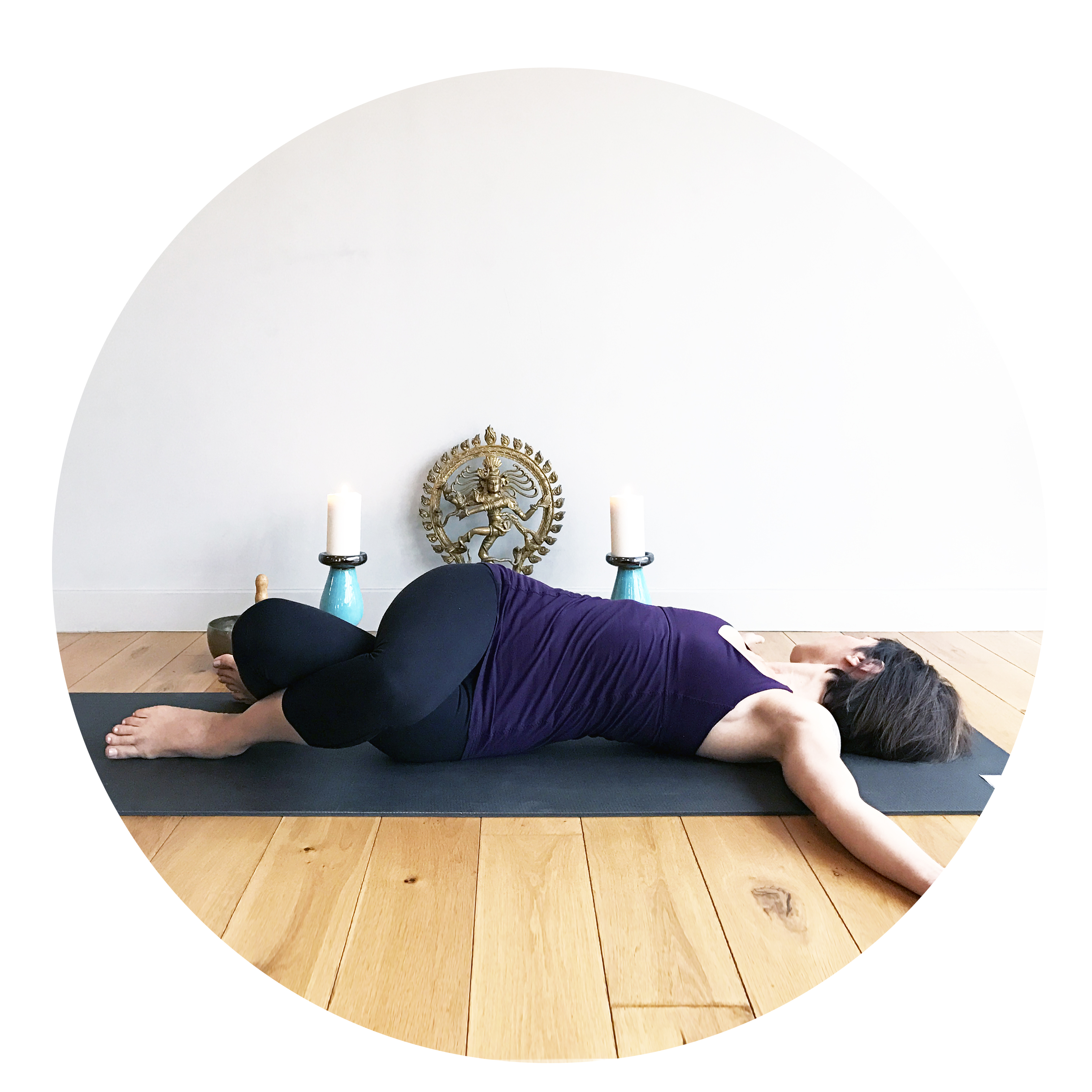 Dizleri bükerek ayaklarınızı yere koyun. Sağ bacağı sol bacağın üzerine atın. Kalçalarınızı hafifçe sağa kaydırıp, dizleri sola düşürün. Kollar iki yana doğru açık olsun. Başınız sağa düşürün. Sağ omzun yerde olmasına özen gösterin.