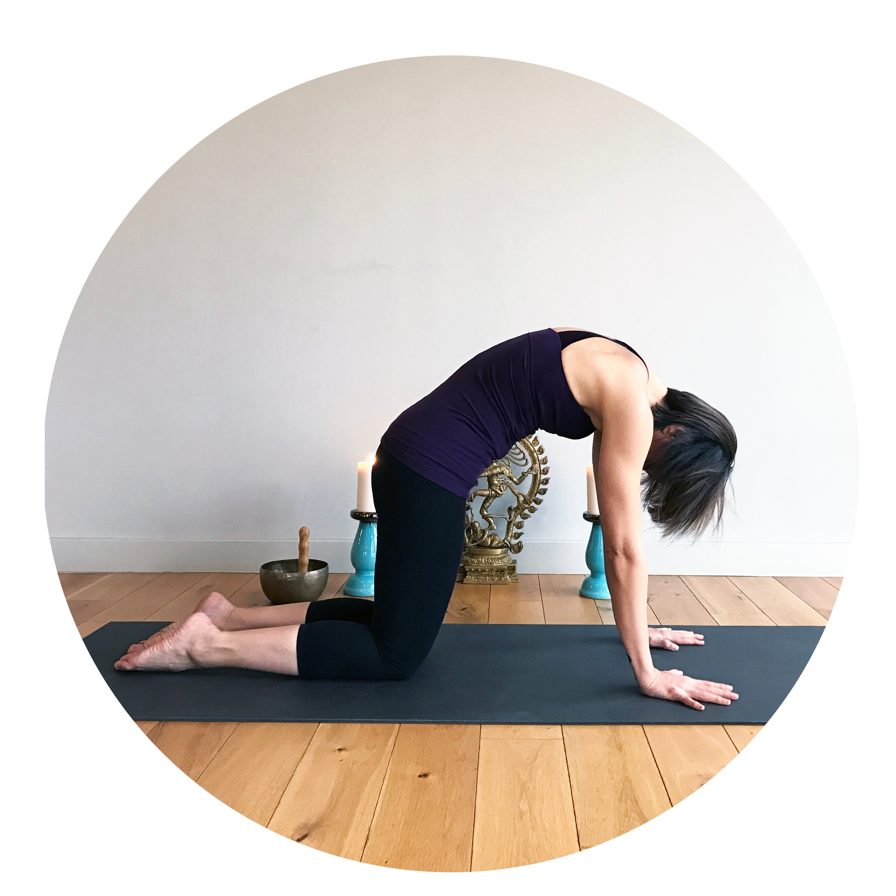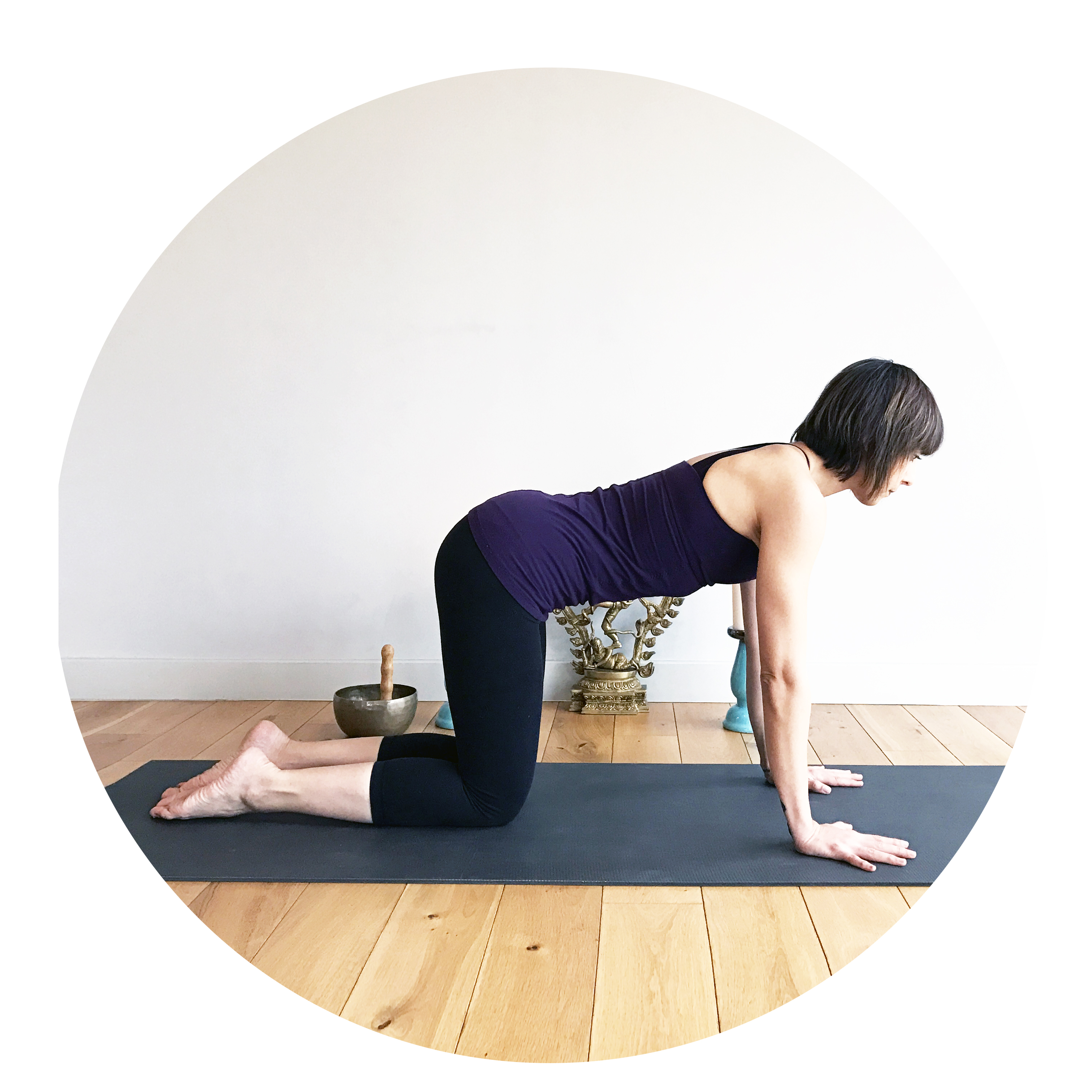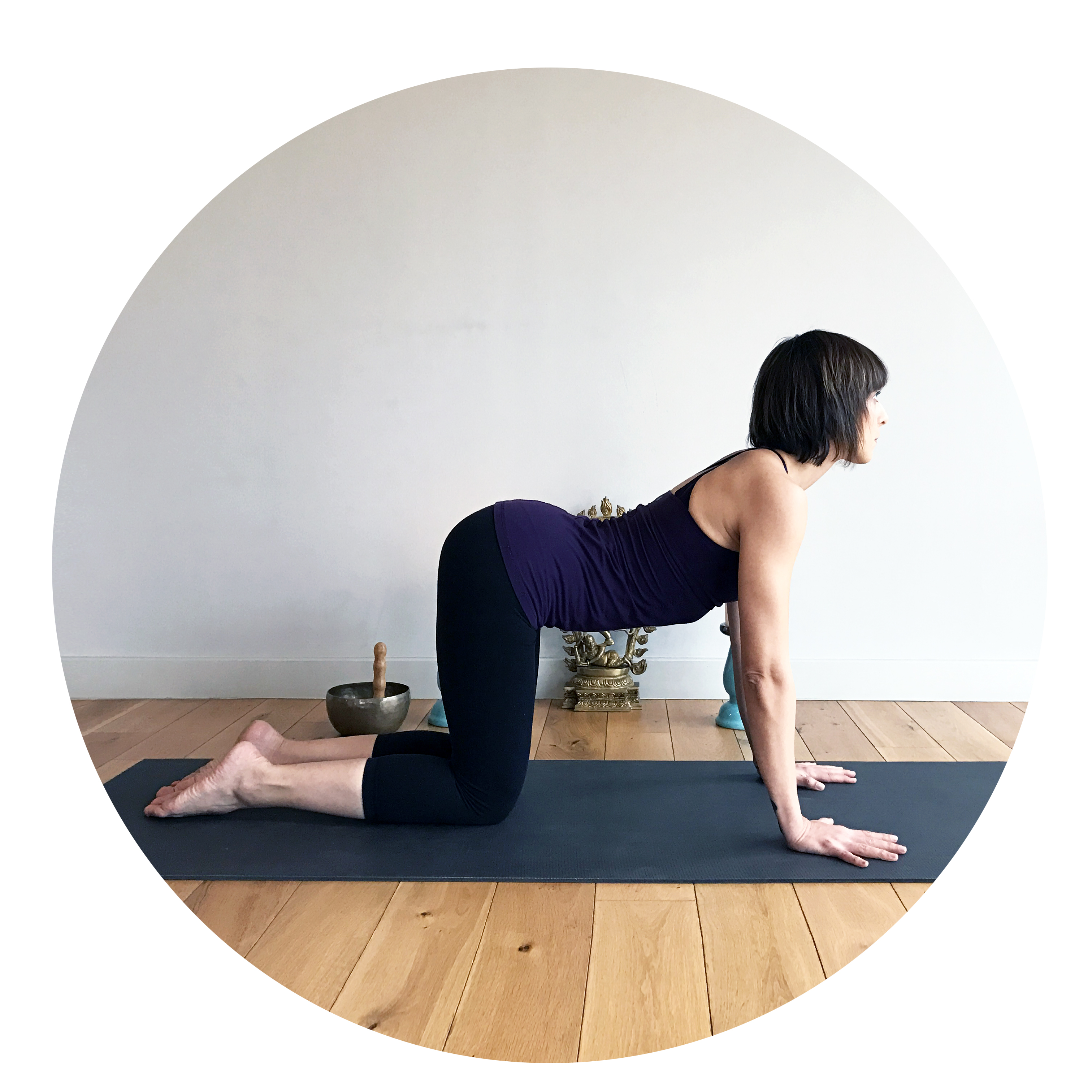 Kedi pozu: Nefes verirken sırtı bir kedi gibi yuvarlayın. Göbek deliği omurgaya doğru hareket etsin. Kuyruk sokumu ve baş ağırlaşıyor.
