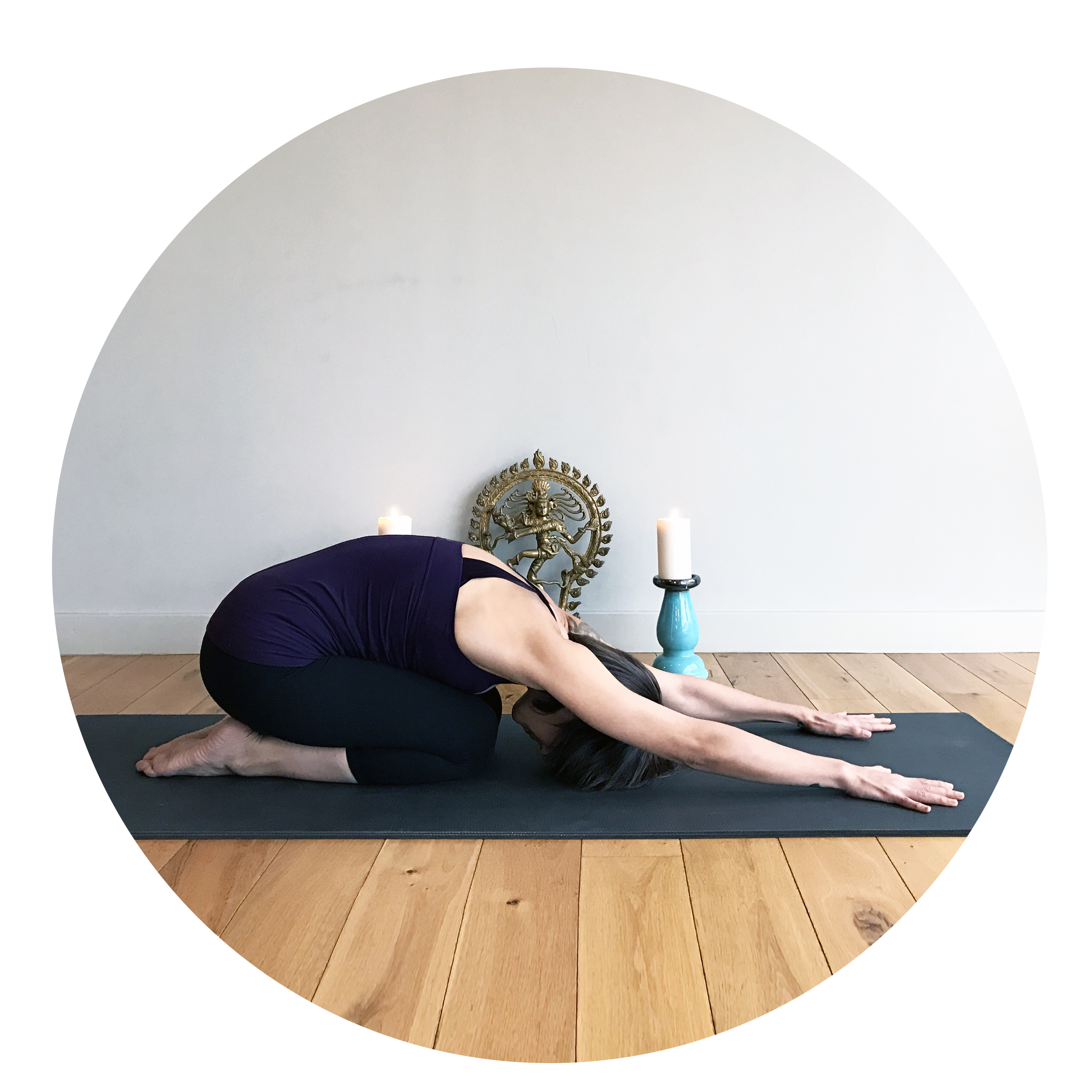 Satangasana’dan nefes verirken kalçaları geriye, topuklara doğru indirin. Kollar güçlü ve uzun kalmaya devam etsin. Nefesler arka bedeni genişletsin.
