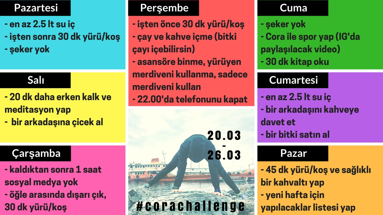 Fazla uzatmadan sevgili Uplifers okuyucuları, bu haftaki #corachallenge’ı aşağıda bulabilirsiniz. Ayrıca Perşembe günü göreceğiniz gibi “görev”, “Cora ile spor yap”tır. Perşembe sabah erkenden Instagram‘da bir video paylaşacağım.
