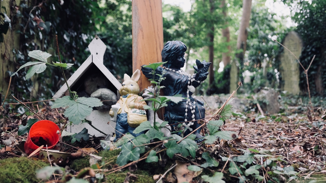 Fakat bu pastoral ambiyans sarı bantlarla çevrilmiş üzerinde “Danger” yazan, birbiri üstünde devrilmiş ve giderek bir anıta dönüşmüş mezarları, melek-haç-çarmıha gerilmiş İsa figürlerini, mezarlara bırakılmış tüyler ürpertici hediyeleri ya da Londra’da görmeyi hiç beklemediğiniz simsiyah bir kediyle anında bitecek.