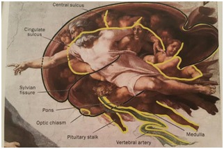 Vatikan’da Sistine Şapeli’nin tavanında bulunan Adem’in Yaratılışı freski her yıl milyonlarca ziyaretçi çeken büyüleyici bir çizimdir. Yüzlerce yıldır orada bulunmasına rağmen, freskteki detaylar 1990 yılında nörobilim uzmanı Dr. Frank Lynn Meshberger tarafından ziyaret edilene kadar kimsenin dikkatini çekmemişti. Anatomi alanındaki detaylı çizimleriyle bilinen Michelangelo’nun en ünlü eserlerinden biri kabul edilen bu freskte, Tanrı’nın arkasına anatomik olarak tam doğrulukta çizilmiş bir beyin resmi bulunuyor. Fresk, yakından incelendiğinde çizimdeki sınırlar beynin iç ve dış yüzeyindeki oluklara, beyin sapına ve hipofiz bezine denk geliyor.