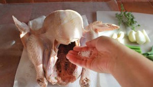 Hindiyi pişirmeden 1 saat önce, oda sıcaklığına gelmesi için buzdolabından çıkarın. Hindiyi iyice yıkadıktan sonra kağıt havluyla durulayın. Hindinin üzerine zeytinyağını gezdirin ve tuz, karabiber ekleyerek iyice yedirin. Hindinin her tarafına yayıldığına emin olun.