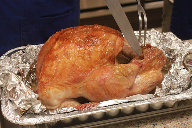 3 buçuk saatin sonunda, hindiyi fırından çıkarın ve buttaki en yağlı bölgeye bir bıçak batırın. Eğer, sebze suyu akıyorsa ve et yumuşaksa, hindiniz hazır demektir!
