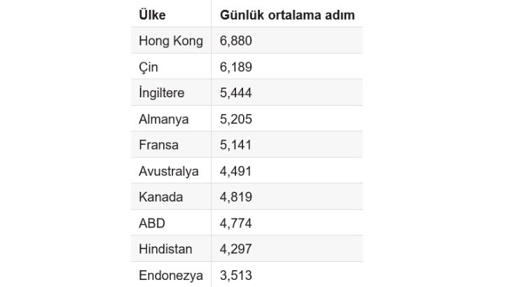 Bazı ülkelerdeki insanlar diğerlerinden daha fazla adım atma eğiliminde olabiliyorlar. 2017’deki bir çalışmada 111 ülkeden 717.527 kişinin adımları 95 gün boyunca akıllı telefonlar ile takip edilmiş.
