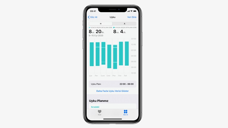 - Günün sonunda dinlenmek için biraz zaman ayırmanızı isteyen bir uyku programı ayarlayarak iPhone’unuzun uyku hedeflerinize ulaşmanıza yardımcı olmasına izin verin.