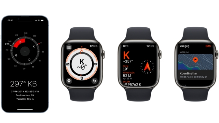 Pusula uygulaması, iPhone’unuzun işaret ettiği yönü, bulunduğunuz konumun koordinatlarını ve rakımı, Apple Watch’un baktığı yönün yanı sıra şu anki konumunuzu ve bulunduğunuz yüksekliği de gösterir.