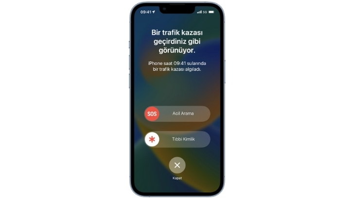 iPhone’unuz ciddi bir trafik kazası tespit ettiğinde acil servis ve acil durum kişileriniz ile iletişim kurmanızı sağlar. Ekranı görememeniz durumunda iPhone’unuz sizin için uyarıyı okur. Yalnızca iPhone’unuz varsa, ekranda bir Acil Durum Arama kaydırıcısı görüntülenir ve iPhone’unuz acil servisleri arar. iPhone’unuz ve Apple Watch’unuz varsa, Acil Durum Arama kaydırıcısı yalnızca saatinizde görünür ve arama sesi saatinizden çalar. Yanıt veremezseniz, cihazınız 20 saniyelik bir geri sayımın ardından otomatik olarak acil servisleri arar. Acil durum kişileri eklediyseniz, cihazınız konumunuzu paylaşır ve araba kazası geçirdiğinizi bildirmek için mesaj gönderir. Tıbbi Kimliğinizi ayarladıysanız, acil müdahale ekiplerinin tıbbi bilgilerinize erişebilmesi için cihazınızda bir Tıbbi Kimlik kaydırıcısı görüntülenir. Bilinciniz kapalıysa cihazınız 10 saniyelik yeni bir geri sayım başlatır. Geri sayımın sonunda, yanıtlamadıysanız cihazınız acil durum servisi ile iletişime geçer.