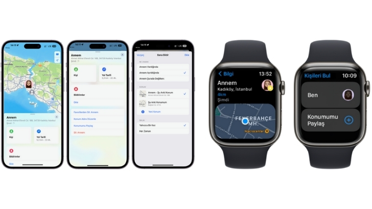 Kişilerinizin konumlarını paylaşabilir, görebilir ve belirlediğiniz kişilerin koordinatlarının varış/ayrılış bildirimlerini alabilirsiniz. Apple Watch’unuzdan Arkadaşlarımı Bul uygulamasıyla sevdiklerinizin konumunu kontrol edebilirsiniz.