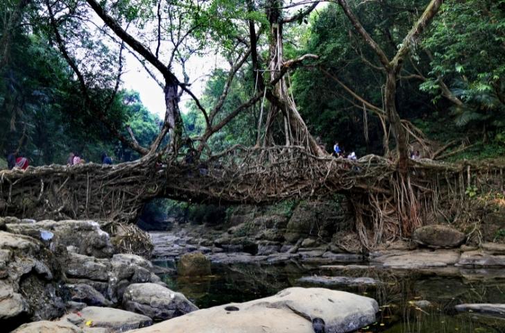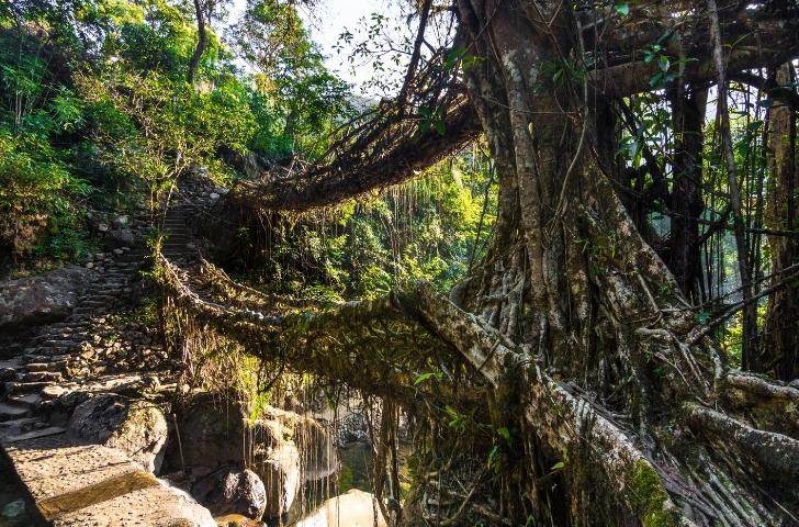 Doğanın oldukça cömert davrandığı; yeşilin ve mavinin her tonunun yer aldığı Meghalaya sonsuz sayıda ağaca ev sahipliği yapıyor. Yağmur suları ve nehirlerle beslenerek güçlenen ağaçlar, yerel halkın bir yerden bir yere ulaşmasını kolaylaştırıyor. Şöyle ki, dağlık bir bölge olmasından dolayı depremlere yatkın olan Meghalaya’da karayolu bağlantısı yok denecek kadar az. Bu nedenle özellikle köylere ulaşım sağlamak için doğayla uyumlu bir geçiş şart. Yerel halk da bu durumu bildiğinden, zengin ağaç popülasyonunu kendi lehine kullanmayı başarıyor ve ağaçtan köprüler inşa ediyor.