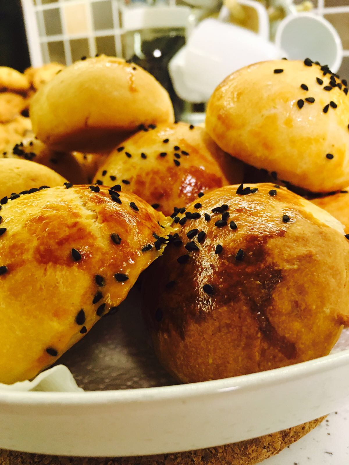 3) Ayırdığımız yumurta sarısını üstüne sürüyoruz. (İsteğe bağlı çörek otu veya susam ile süsleyebiliriz) Yaklaşık 16 adet poğaça 180 derece önceden ısıtılmış fırın 25 dakika pişiyoruz.