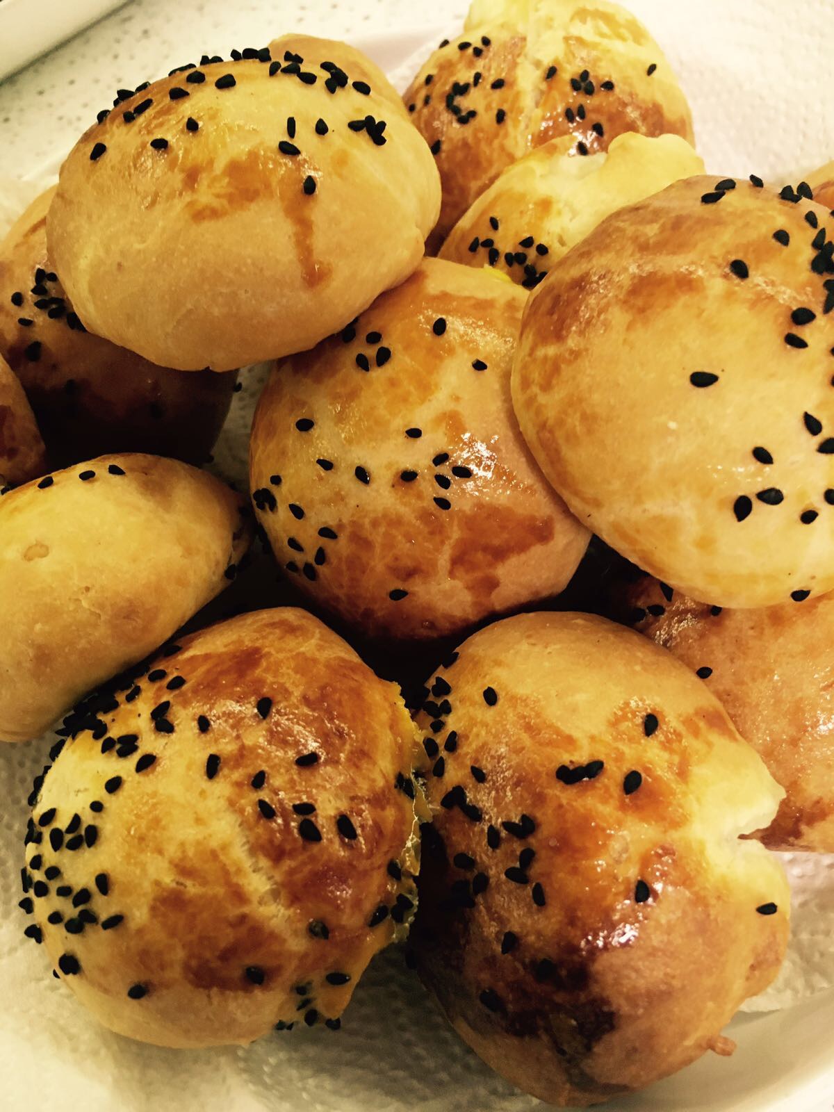 2) Hamurdan cevizden az büyük parçalar alıp elimizde hafif açıyor ortasına 2 adet top peynir koyup yuvarlıyor tepsiye diziyoruz.