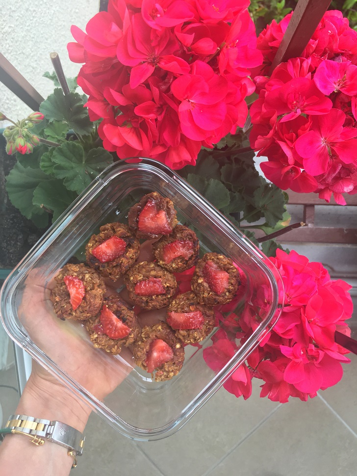 7. Çıkardıktan sonra ve soğumasını bekledikten sonra süslemek amaçlı; her topun üzerine şekersiz badem ezmenizden birer çay kaşığı koyun. Daha sonra taze çilekleri ince ince keserek üstüne yerleştirebilirsiniz, lezzete lezzet katacaktır!