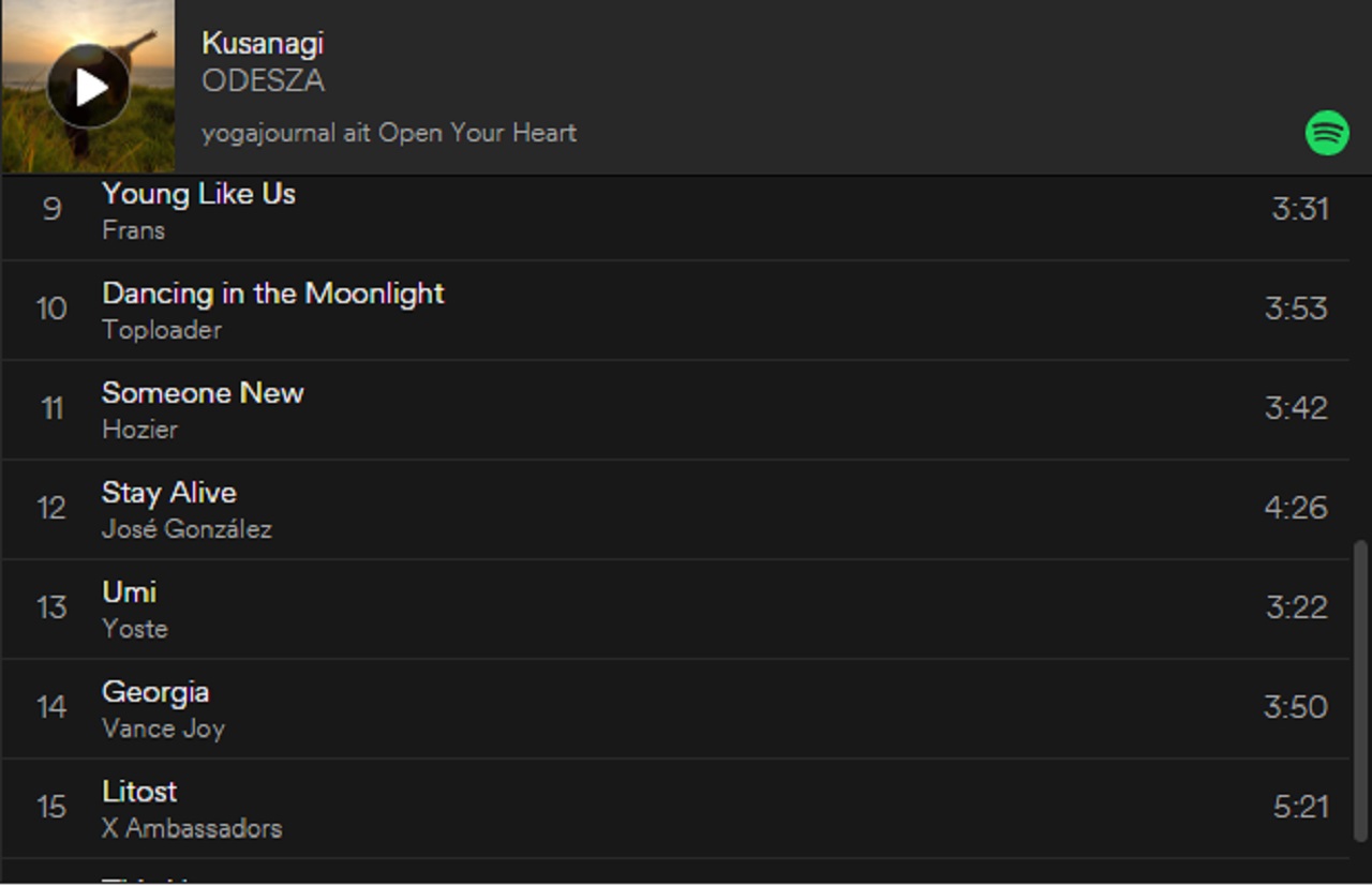Yaşanılan aşk acıları, içe kapanıklık, duyguların dışa vurulmaması, kendini doğru ifade edememe gibi durumların oluşturduğu bu tıkanıklıkları doğru yoga pozları ve seanslarıyla birlikte kalbinizi yumuşatan şarkılarla açmanız mümkün. İşte yoga sırasında kalp çakranız “Anahata”yı açacak 60 dakikalık huzur verici şarkı listesi: