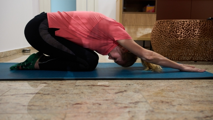 Diz çökerek başlayın. Dizlerinizi hafif açın, kalçanızı topuklarınıza doğru gönderin ve kollarınızı öne uzatın. Alnınızı yere yaklaştırın. 30 saniye boyunca derin nefes alın.
