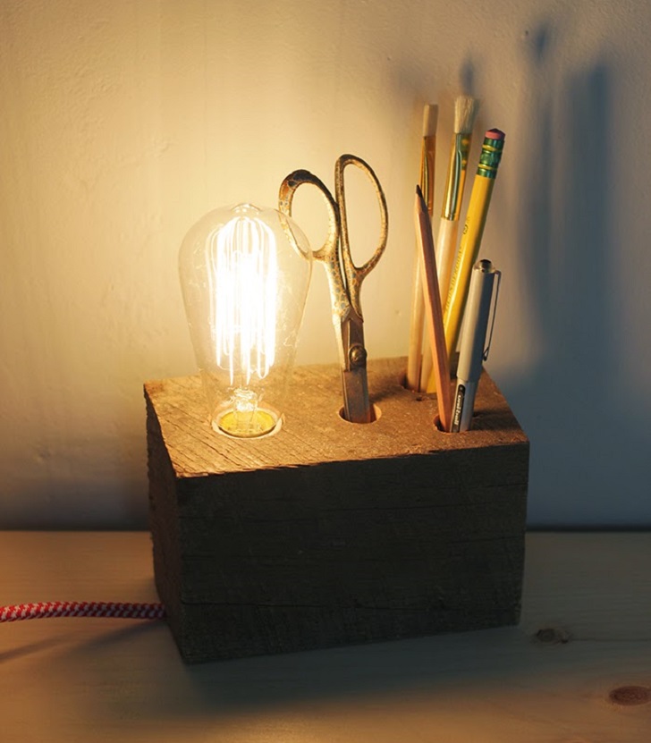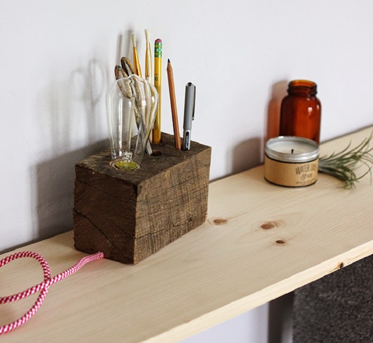 Öncelikle duyun geçebileceği boyutta matkap kullanarak ahşap plakanızda delik açın. Sonrasında matkabın daha ince uçlarıyla plakanın yan tarafına kalem, silgi, fırça gibi malzemelerin sığabileceği 2-3 ayrı delik açın. Ahşabın üstündeki delikleri açtıktan sonra, ahşap törpüsüyle plakanın yan tarafından bir tünel açın. Açtığınız deliğin yeterince yuvarlak ve derin olmasına dikkat edin. Daha sonra duyunuzu açtığınız tünelden geçirin –olabildiğince gergin durması önemli, böylelikle ampulunuz dik bir şekilde duracak-. Açtığınız tüneli fazla geniş yapmamak için ölçerek gitmenizde fayda var.