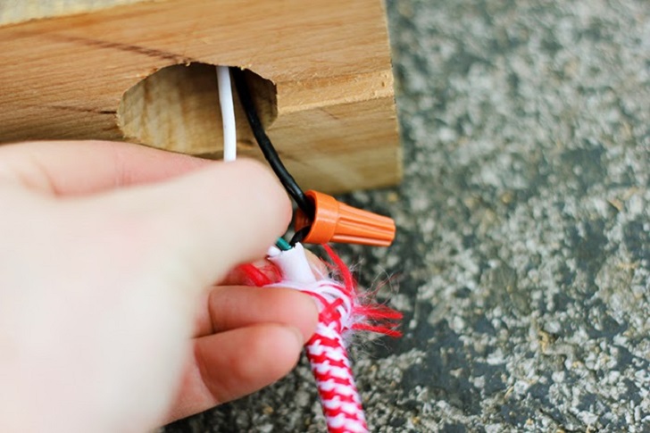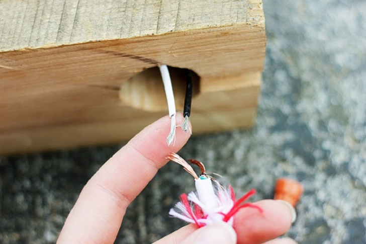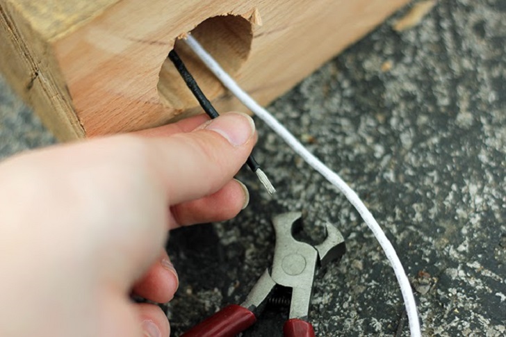 Kablolarınızı ahşap plakanızın dışına çıkacak şekilde, duyunuzdan tel kesici yardımıyla kesin. Tel kesicini kullanarak yapmanız gereken diğer şeyse kablolarınızın tellerinden yaklaşık 2.5 cm kadar bir tel açığa çıkarın. Siyah kabloların uçlarını birbirine çevirin ve onları bir arada tutmak için bir adet somun kullanın. Aynı işlemi beyaz tellerde de uygulayın. Bu kabloları ve tel somunları duyun içine yerleştirin ve kabloyu açtığınız delikten geçirin. Son olarak ampulunuzu yerleştirin ve fonksiyonel masaüstü bölmenizin tadını çıkarın.
