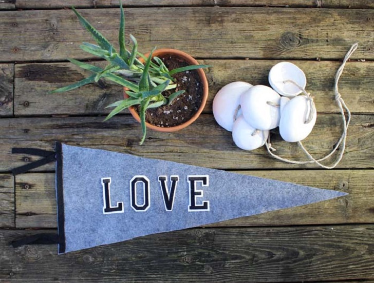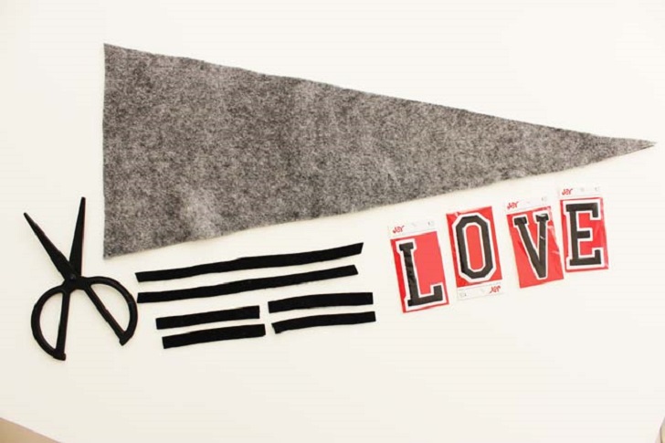 İlk olarak gazete kağıdınızı üçgen bir şablon şeklinde kesin. Daha sonra şablonunuzu büyük keçe parçanızın üzerine koyarak kenarlarından kesin. Daha için farklı renkteki keçenizi şerit halinde keserek üçgen parçanın uzun kenarına silikon tabancasıyla yapıştırın. Yapıştıracağınız harflerle istediğiniz mesajı yazıp keçenizin üzerine ütüyle sabitleyin. Ve mesajlı bayrağınız hazır!
