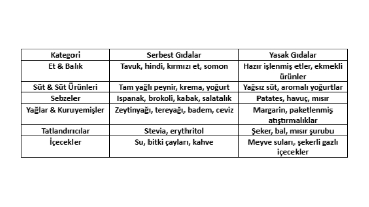 Ketojenik diyet rehberinde yasak ve serbest gıdalar listesi şöyledir: