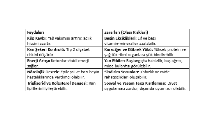 Ketojenik diyetin faydaları ve olası riskleri şöyledir: