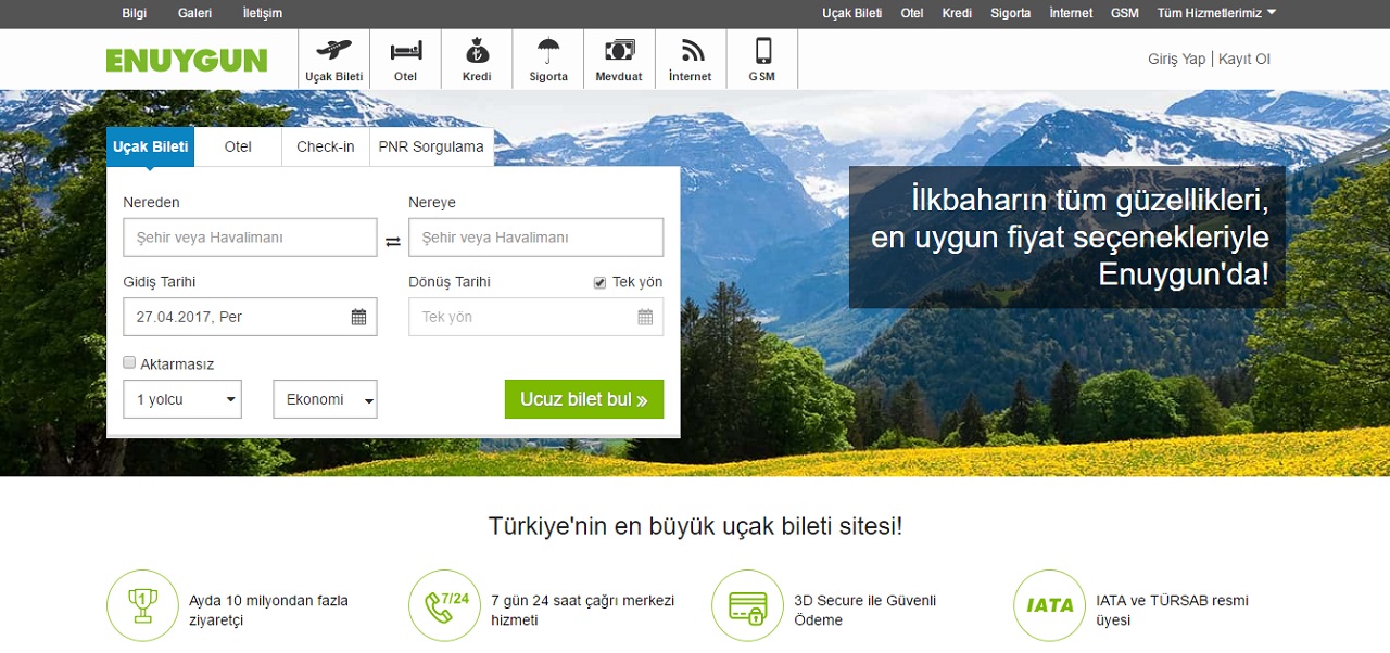 Güneşli bahar günlerinde ideal hafta sonu programı, kısa süreli de olsa yurt içi ya da yurt dışı kaçamakları yapmak; kaçamaklarınız esnasında yolculuk masrafını minimumda tutmak mı? Eğer öyleyse Enuygun ile tanışmanızda fayda var! Rutininden uzaklaşmak yeni yerler görmek, yeni tatlar denemek ya da uzakta olan arkadaşlarının ve ailelerinin yanına kaçmak isteyenlerin sık kullanılanları arasında yer alması gereken Enuygun; varış noktanıza “en uygun” şekilde ulaşmanızı sağlıyor. Tüm uçak şirketlerinin fiyatlarını karşılaştırmalı bir şekilde listeleyen Enuygun ile bütçenizi zorlamadan aradığınız bilete ulaşabilirsiniz. Bulunduğunuz yeri, gitmek istediğiniz noktayı ve gitmek istediğiniz saati girmeniz yeterli, sonrasını Enuygun’a bırakın!