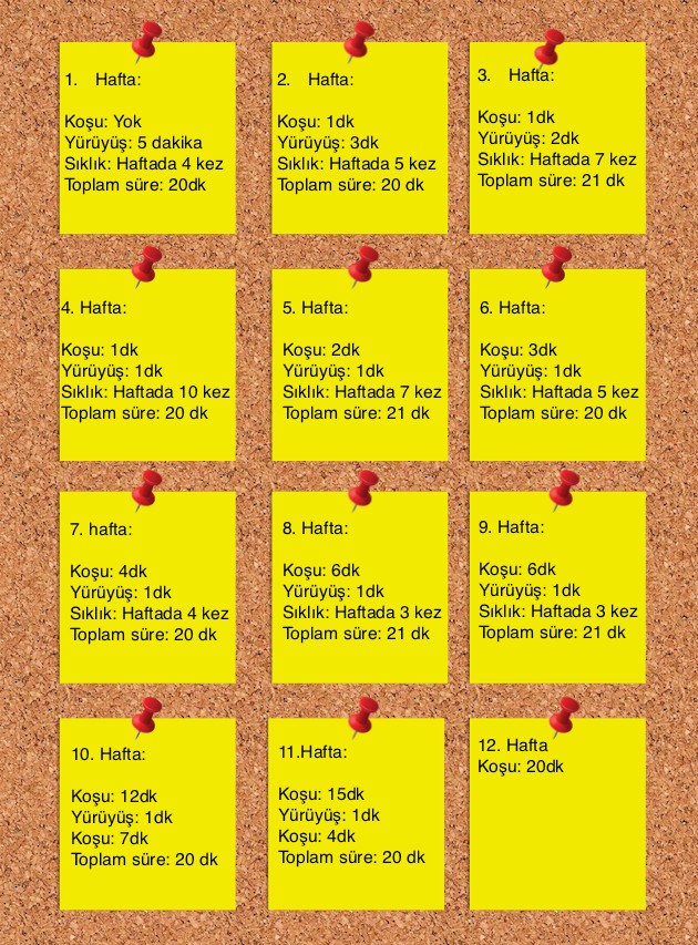 Hem grup halinde hem de bireysel olarak yapılabilen koşu sporuna başlamak isteyen, ancak nereden ve nasıl başlamaları gerektiğini bilmeyenler için 12 haftalık, adım adım ilerleyen bir program hazırladık. Öncelikle ağırlıklı olarak yürüyüşün, sonrasında ise koşunun yer aldığı bu başlangıç programını uyguladıktan sonra koşu sürenizi dilediğiniz kadar artırarak sınırlarınızı zorlayabilirsiniz.