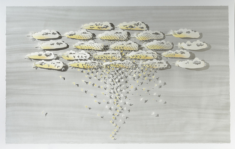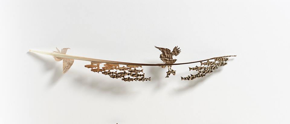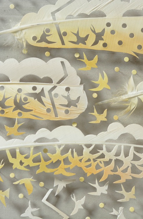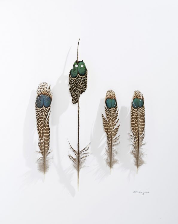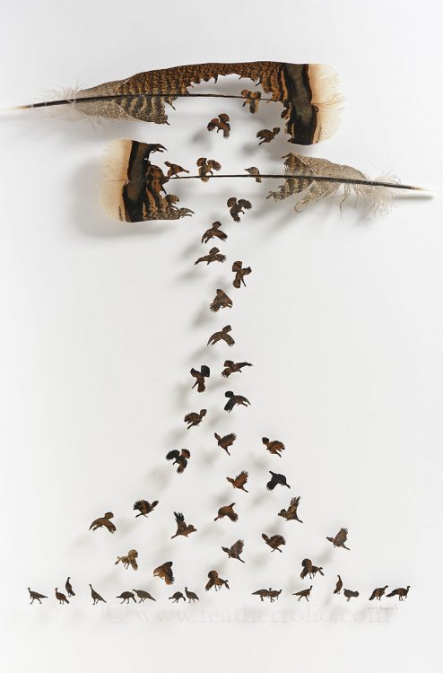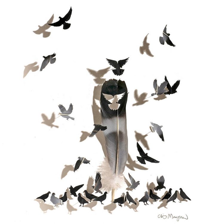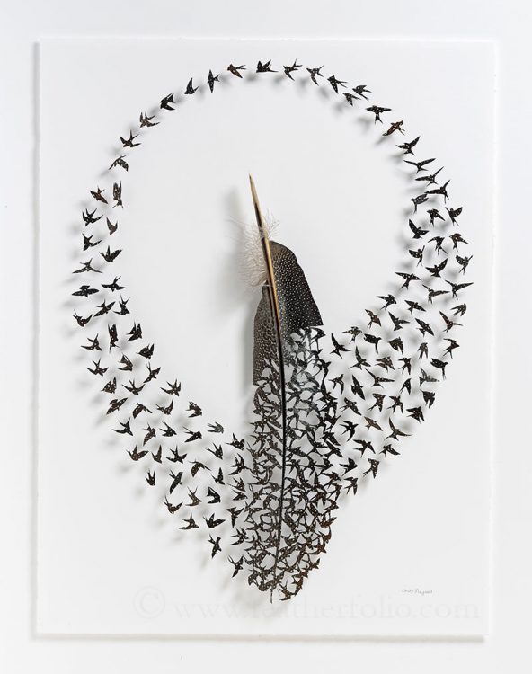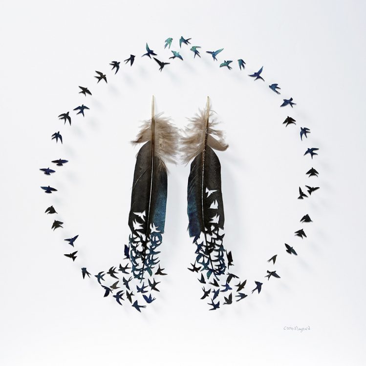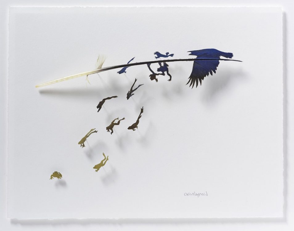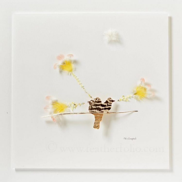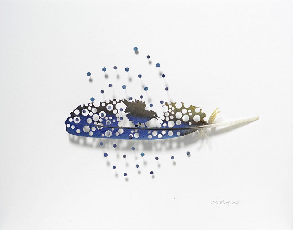 Washingtonlu Chris Maynard, kuş tüylerinden şaheserler yaratan bir sanatçı. Eğitimini biyoloji ve ekoloji alanlarında tamamlayan Maynard, kuş tüylerinin 12 yaşından beri dikkatini çektiğini, o yaşlarda ebeveynlerine ait büyüteç ve cerrahi makas gibi aletlerle bu tüylerden şekiller yaptığını belirtiyor. Maynard’ın hayvanat bahçelerinden ve büyük kuş kafeslerinden toplayarak yaptığı büyüleyici çalışmalarını galerimizde bulabilir, daha fazlasını merak ediyorsanız sanatçının Facebook hesabına bakabilirsiniz.