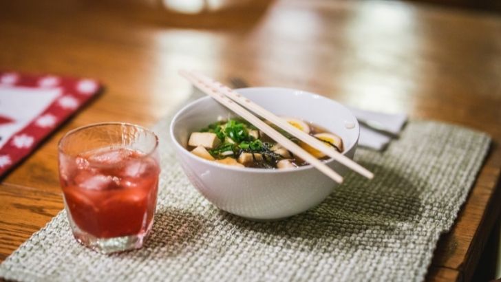 - Kombu ve shiitake mantarları ile haşlanmış sebze, yanında dip sos