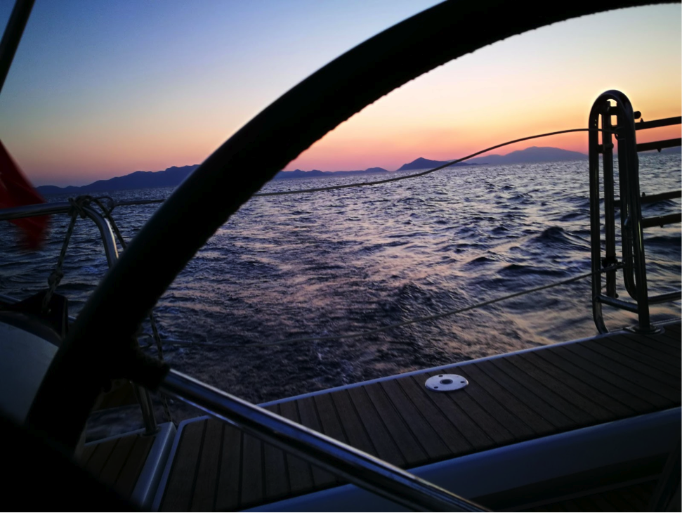 Teknemiz hakkında da biraz bilgi vermek istiyorum, Kino isimli Benetau marka, Oceanis 41 model, yani uzunluğu 41 feet. 3 kamaralı, ocaklı, fırınlı, kompakt ve konforlu bir tekne. Yelkenleri kontrol etmesi ve dümende olması çok pratik bir tekne, üstelik yelken seyrinde burunda oturup deniz ve rüzgar hışırtısıyla uzaklara dalıp gitmek kelimelerle anlatılamayacak kadar da huzurlu…