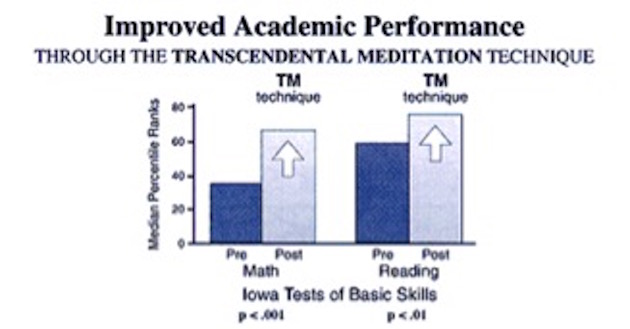 - Iowa (ABD) merkezli araştırmalar, matematik ve okuma konularında, ulus çapında kullanılan standart testlerde gösterilen akademik başarının transandantal meditasyon eğitimi almış olan öğrencilerde daha yüksek olduğunu gösterdi.