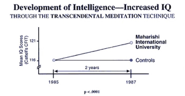 - Maharishi Uluslararası Üniversitesi’nde yapılan iki yıllık bir çalışma boyunca, transandantal meditasyon yapan gönüllülerin, yapmayan gönüllülere göre (kontrol grubu) IQ’lerinde 5 puana varan artış tespit edildiği gösterildi.