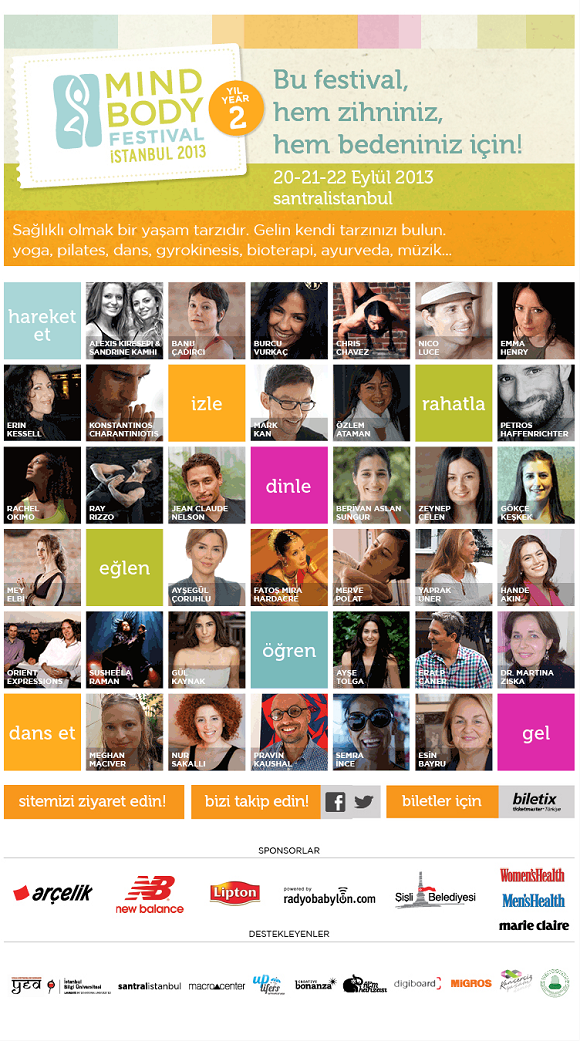Yoga, Pilates, Gyrotonic, Dans, Tai Chi, Qi Qong, nefes, refleksoloji, tantra, bioterapi eğitmenleri beslenme uzmanları, ayurvedik doktorlar, filozoflar, tasavvuf ustalarını ağırlayan festivalin bu yıl ikincisi düzenlenmektedir.