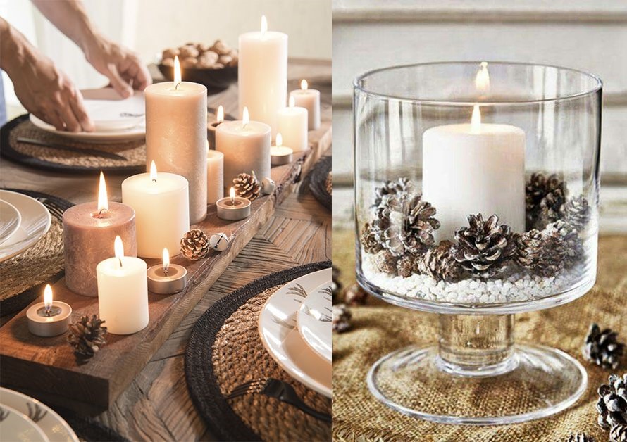 Mumlar soğuk kış gecelerinin vazgeçilmezi ve Noel dekorasyonlarının da önemli bir tamamlayıcısı oluyor. Mumlarınızı büyük cam vazolar içine yerleştirip etrafına size Noel’i anımsatan objelerle zenginleştirebilirsiniz. Çam kozalakları, çam dalları, suni kar, minik geyik bibloları bunlara birkaç örnek…