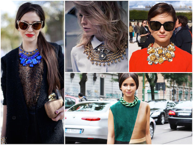Özellikle hareketlendirmek istediğimiz düz siyah elbiselerimizi, zıt tonlarda kırmızı, altın sarısı veya açık mavi gibi büyük taşlarla veya boncuklarla tasarlanmış büyük kolyeler kullarak, veya yine büyük boyda aynı tonlardaki küpelerimiz ile ve hatta aynı tonda kullanacağımız yüksek topuklu ayakkabımız ile oldukça şık görünmemiz mümkün. Yine daha rahat iş kıyafeti seçimlerimizi, özellikle ceket içine kullanabileceğimiz veya gömleklerimizin yakalarına da farklı tasarımlar ile bağlayabileceğimiz büyük kolyeler ile kombinlememiz uygun olacaktır.