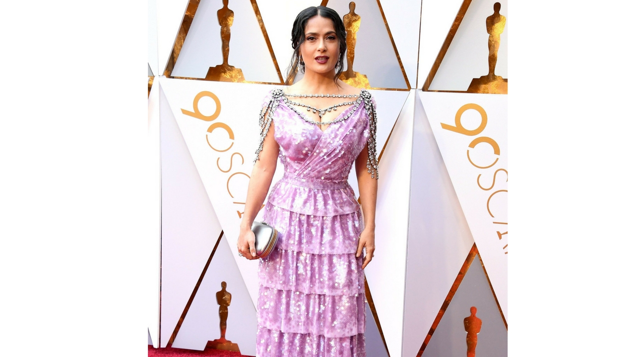 Eflatun rengi hafif, duyuları keskinleştiren, iç dengeyi sağlayan özelliklere sahiptir. Bu özellikleri ile Pitta ve Kapha’yı dengeler, Vata’yı arttırır. Eflatun renkli, taşlarla bezenmiş bir tuvalet tercih eden Salma Hayek, renkli enerjisiyle dikkat çekti.