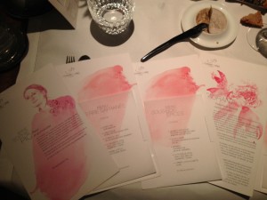 Siparişinizi vermeden önce fırından yeni çıkmış ve üzerine kahveli tereyağı sürülmüş ekmekler karşılıyor sizi. Menu seçiminizi kolaylaştırmak için, üç adet parfüm deneme çubuğu geliyor, herbiri seçme opsiyonunuz olan üç ayrı menünün kokularını taşıyor. Michelin yıldızlı bir restorana göre ekonomik addedilebilecek bir menüsü de mevcut La Dame de Pic’in.