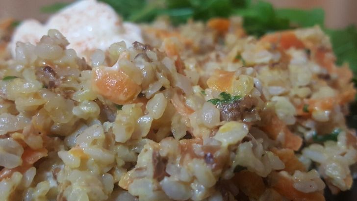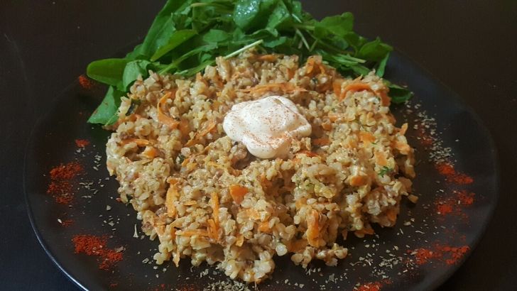 - Haşlanmış karabuğdaylar süzüldükten sonra kavrulmuş havuç karışımı ve 2 yemek kaşığı vegan mayonezle karıştırılarak servis yapılır.