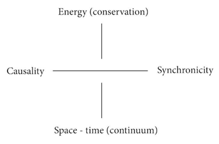 İşte bu gelişmelerin olduğu ve tüm dünyada büyük buhranın yaşandığı bu dönemde, ünlü fizikçi Wolfgang Pauli ile Analitik Psikoloji’nin kurucusu Carl Gustav Jung’un yolları bir şekilde kesişti. Bu dönemde genç fizikçi Pauli ikili sayılabilecek bir hayat yaşıyordu, gündüzleri oldukça disiplinli ve ahlaki normlar içinde bir yaşantı sergilerken, geceleri bunun tam tersi bir karaktere bürünmeye başlamıştı. Alkol sorunu ve annesinin intiharı ile tetiklenen depresyonu üzerine yakınlarının ısrarı ile Pauli Ocak 1932’de, kendi evine çok yakın bir mesafede yaşayan ünlü psikiyatrist Carl Jung’la görüşmeye gitti. Jung’a gitmeden önce onun bütün eserlerini incelemiş ve “Psikolojik Tipler” adlı eseri oldukça ilgisini çekmişti. Bunun sebebi, Jung’un insan tipolojisi ile Bohr’un Tamamlayıcılık İlkesi arasında bir benzerlik olduğunu fark etmesiydi. Peki, fizik bilimiyle ilgili bir ilke nasıl oluyor da insan psişesini açıklamaya çalışan bir model ile bu şekilde örtüşüyordu? İşte bu durum Pauli’nin oldukça ilgisini çekmişti. Önce Jung’un öğrencisi Erna Rosenbaum ile görüşmelere başlayan Pauli, daha sonraları bizzat Jung ile çalışmaya başladı. Bu görüşmelerde Pauli’nin gördüğü 355 rüya üzerinde çalıştılar ve geldikleri noktada vardıkları sonuç şu oldu: Hem makro ve mikro evren, hem de insan psişesi bir tür dörtlülük (3+1) üzerinden çalışmaktaydı. İnsan psişesindeki dörtlülük; düşünmeye karşı hissetme ile duyumsamaya karşı sezgi iken, fizikteki dörtlülük enerji ve momentuma karşı uzay-zaman sürekliliği ile nedenselliğe karşı “senkronisite” idi. Aralarındaki mektuplaşmalarda Pauli Jung’a, Analitik Psikoloji’deki düşünme-hissetme-duyumsama-sezgi dörtlülüğüne karşı, Einstein’ın devrim olarak uzay ve zamanı tek bir varlıkta “uzay-zamanda” birleştirdiğini belirterek aşağıdaki diyagramı önerdi: