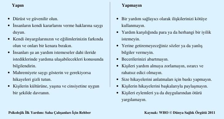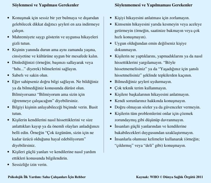 Psikolojik ilk yardım konusunda daha fazla bilgi sahibi olmak için siz de Dünya Sağlık Örgütü tarafından hazırlanan çok kapsamlı psikolojik ilk yardım kılavuzunu buradan inceleyebilirsiniz.