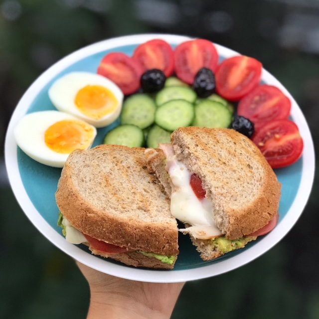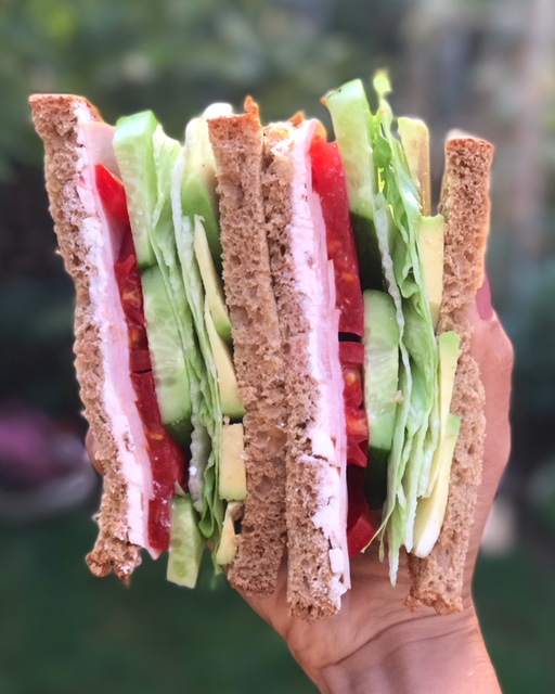 2 dilim tam buğday tost ekmeğinin arasında süzme peynir, hindi füme, domates, salatalık, göbek salata ve avokado var. Saatlerce tok kalmak garanti.